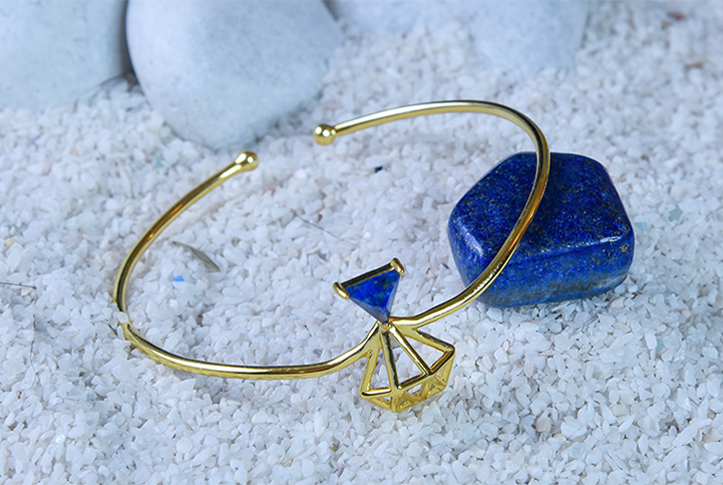Silver cuff in gold finish with lapis lazuli, a modern and delicate geometric piece for protection.