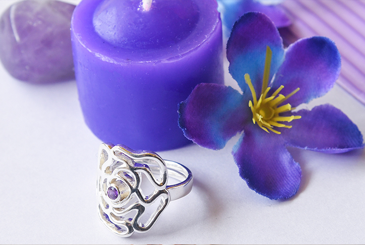 Silver ring with amethysts, an exquisite floral tribute to nature for spiritual healing and cleansing.